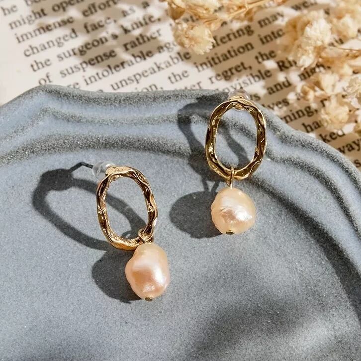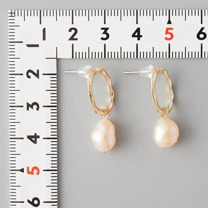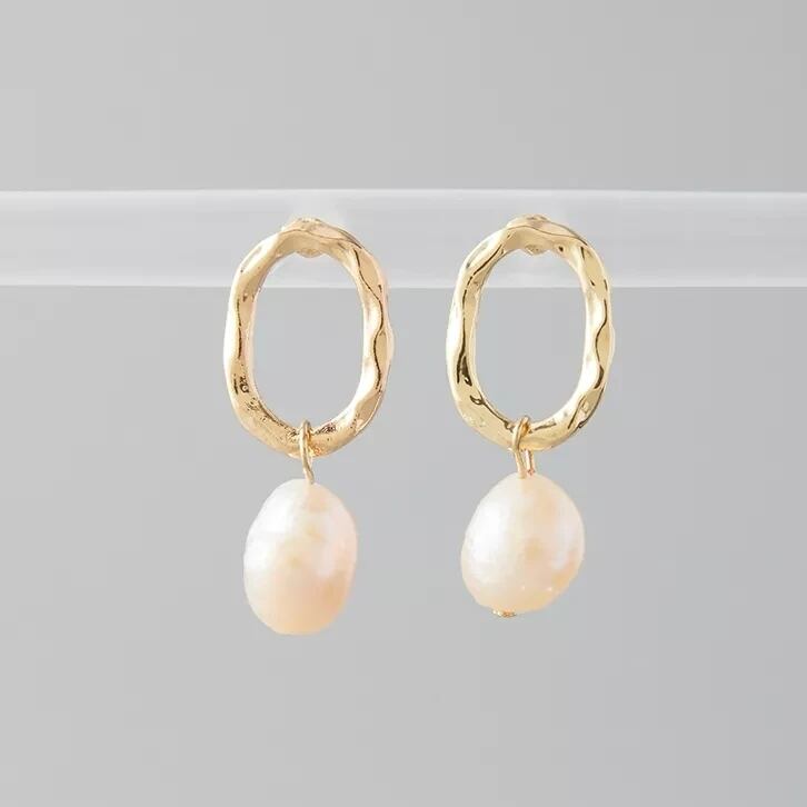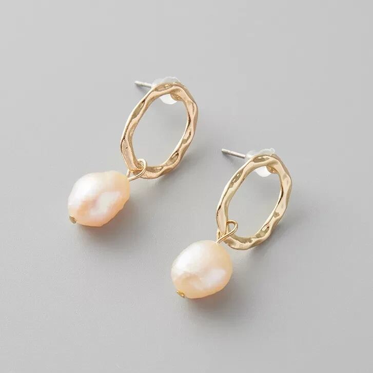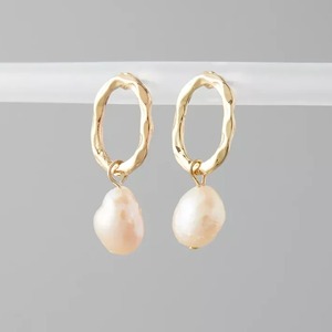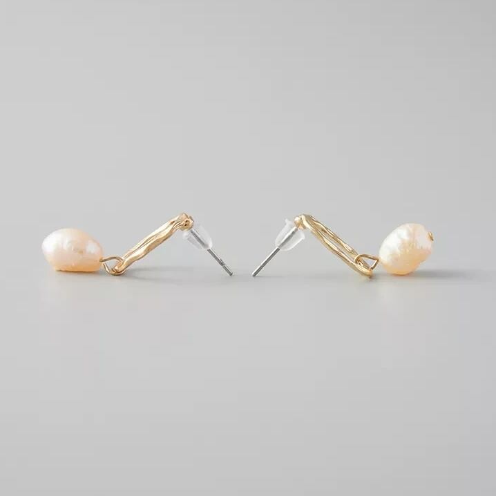 左右不揃いな形が可愛らしい、薄いピンク系淡水パールのスタッドピアスです。