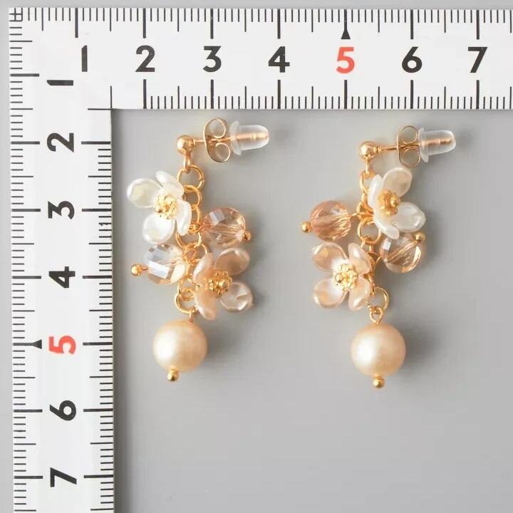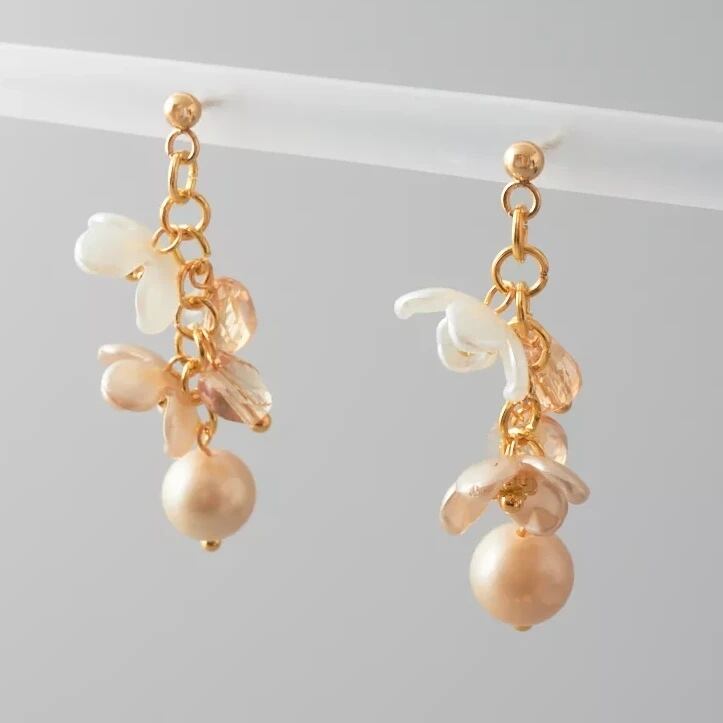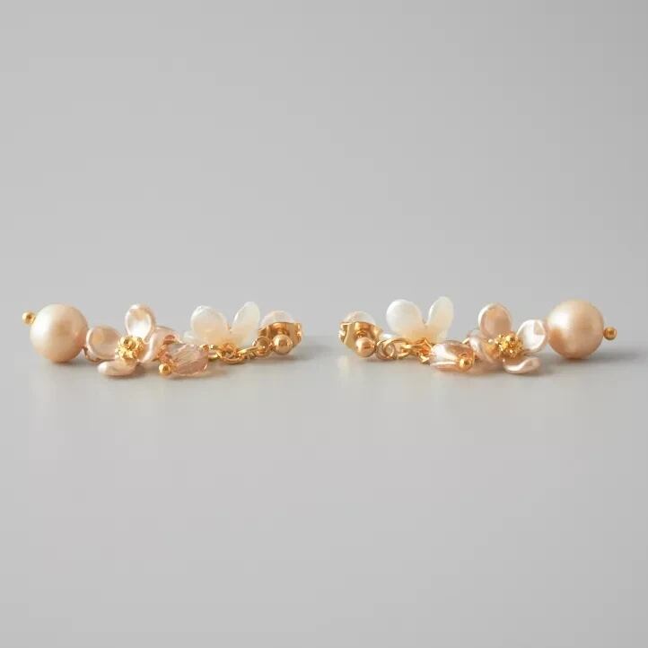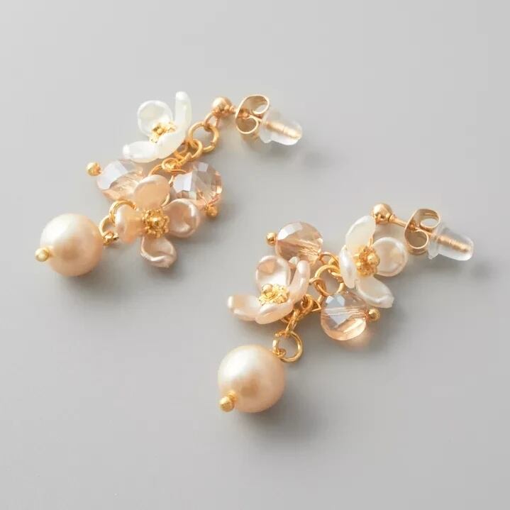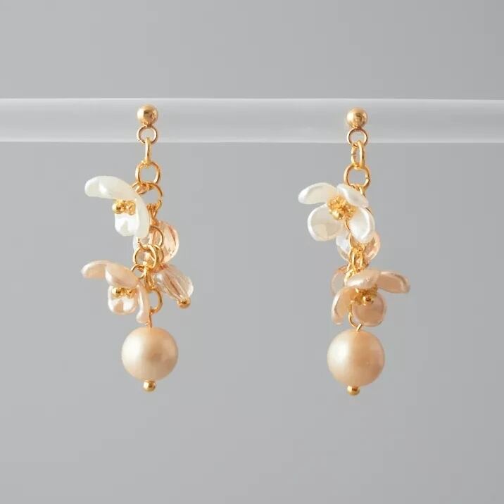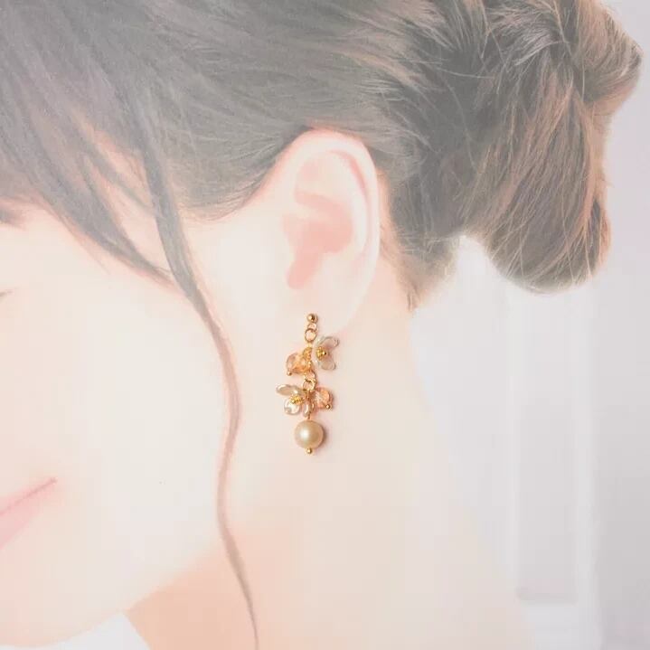 シャンパンゴールドの花型ビーズと透明感のあるガラスビーズが交互に連なり、耳元で優雅に揺れるデザインに仕上げました。