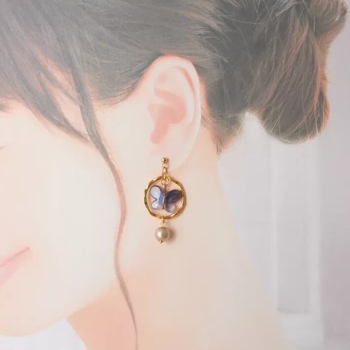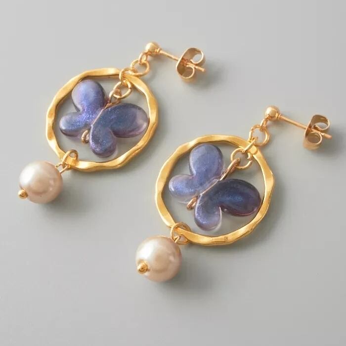 ラメ入りのアクリル製蝶モチーフが、まるで夜空を舞うように優雅に揺れるピアス。