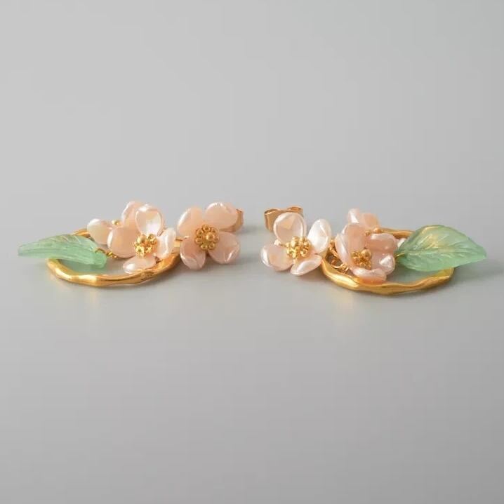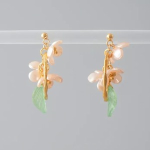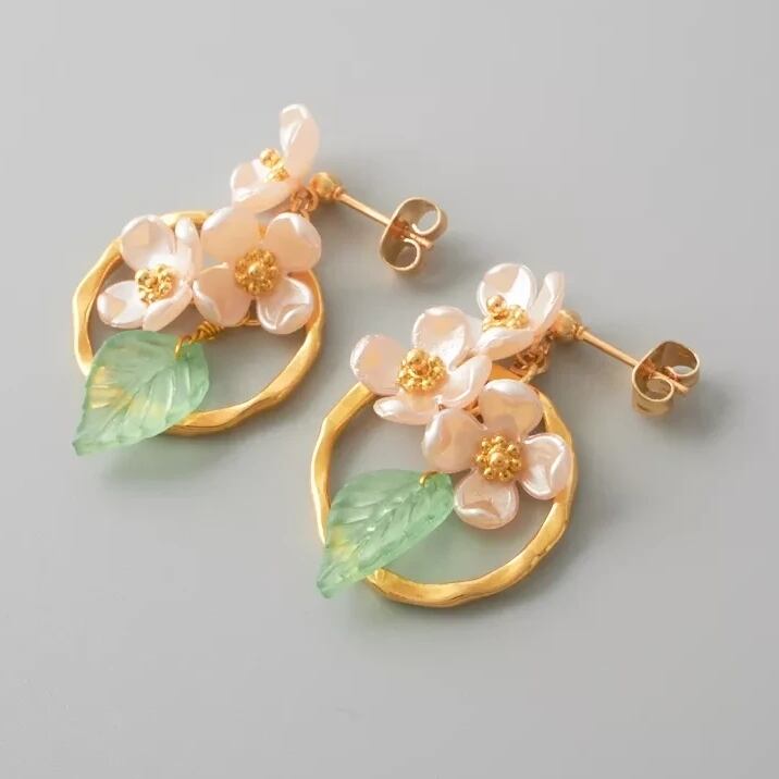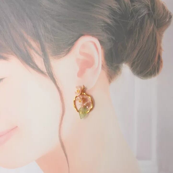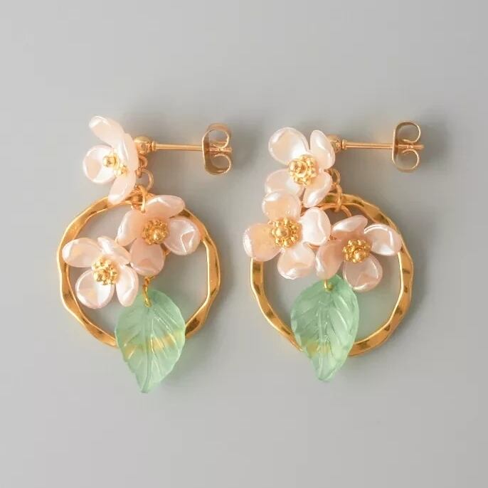 繊細なアクリルビーズの花と葉が軽やかに揺れ、耳元を上品に彩ります。
